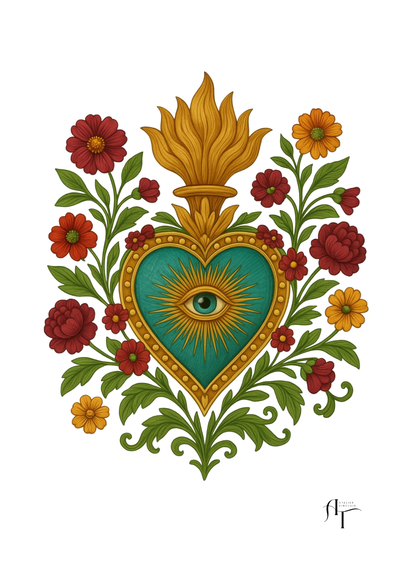 Un cœur turquoise flamboyant, entouré de fleurs éclatantes et orné d’un œil rayonnant. Inspirée des ex-votos, cette affiche invite à la protection et à la lumière positive.