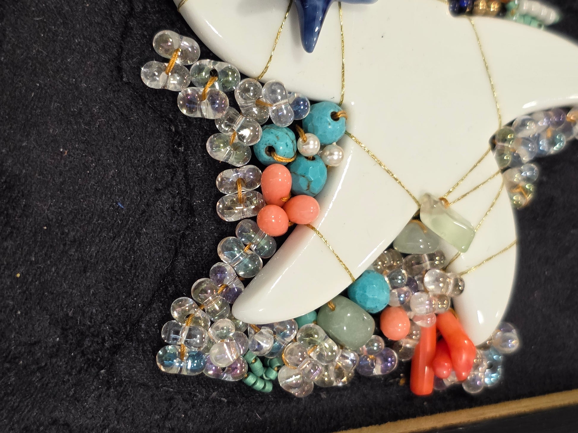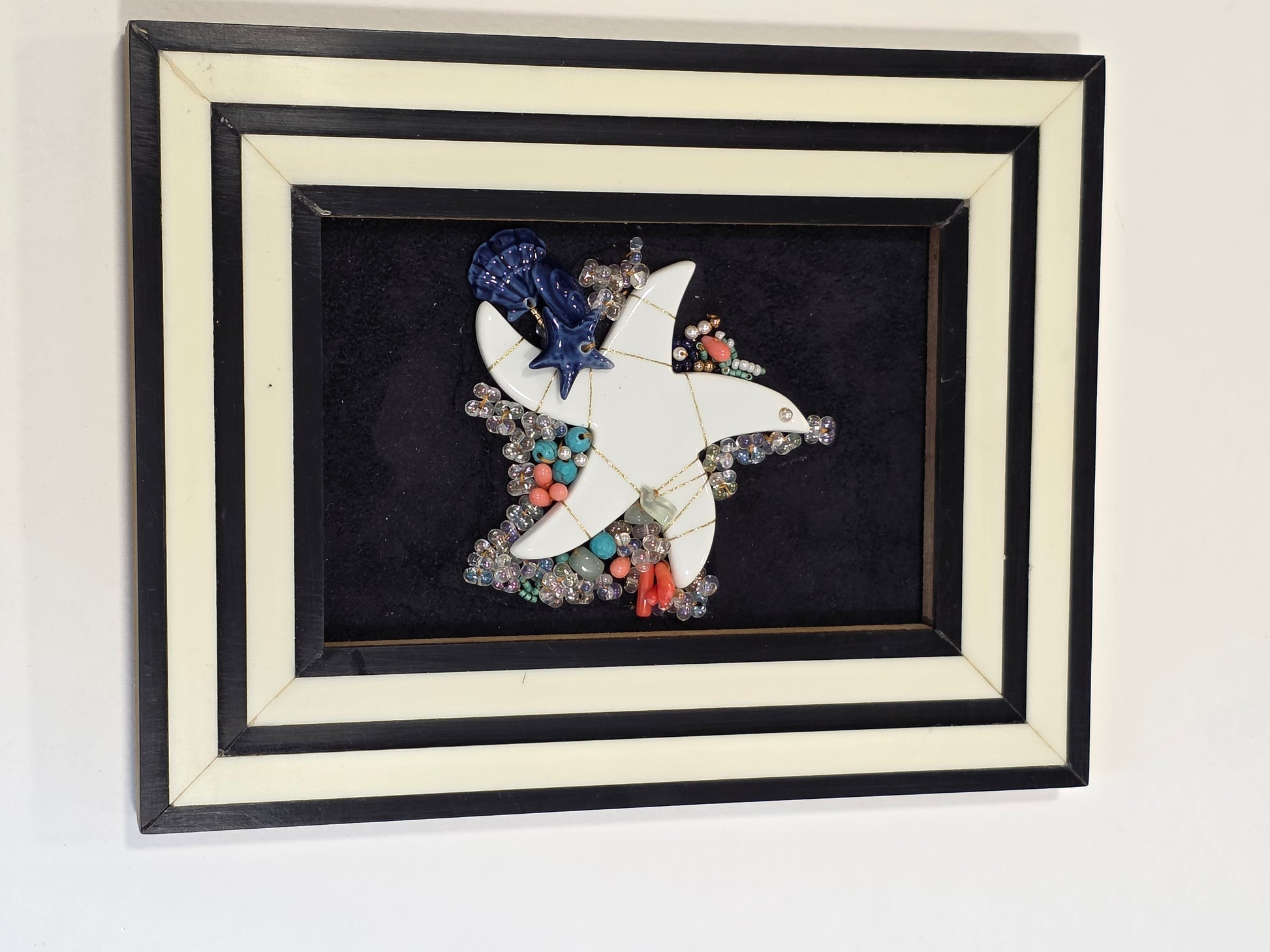 Ce petit cadre unique met en valeur une étoile en porcelaine de Limoges, délicatement mise en scène avec des perles brodées aux reflets irisés et des éléments marins en céramique (coquillage, étoile de mer). Les perles colorées – corail, turquoise, nacrées – évoquent un trésor échoué sur le rivage.