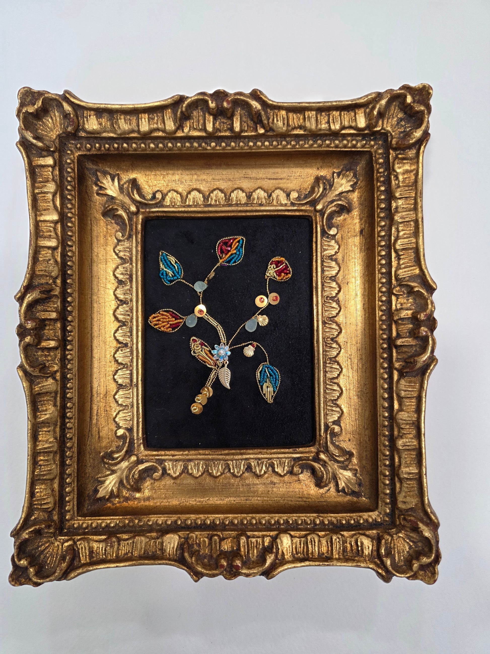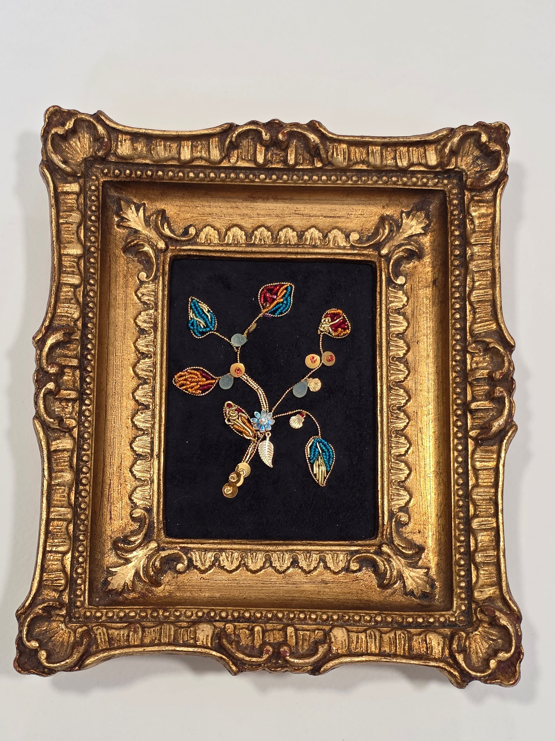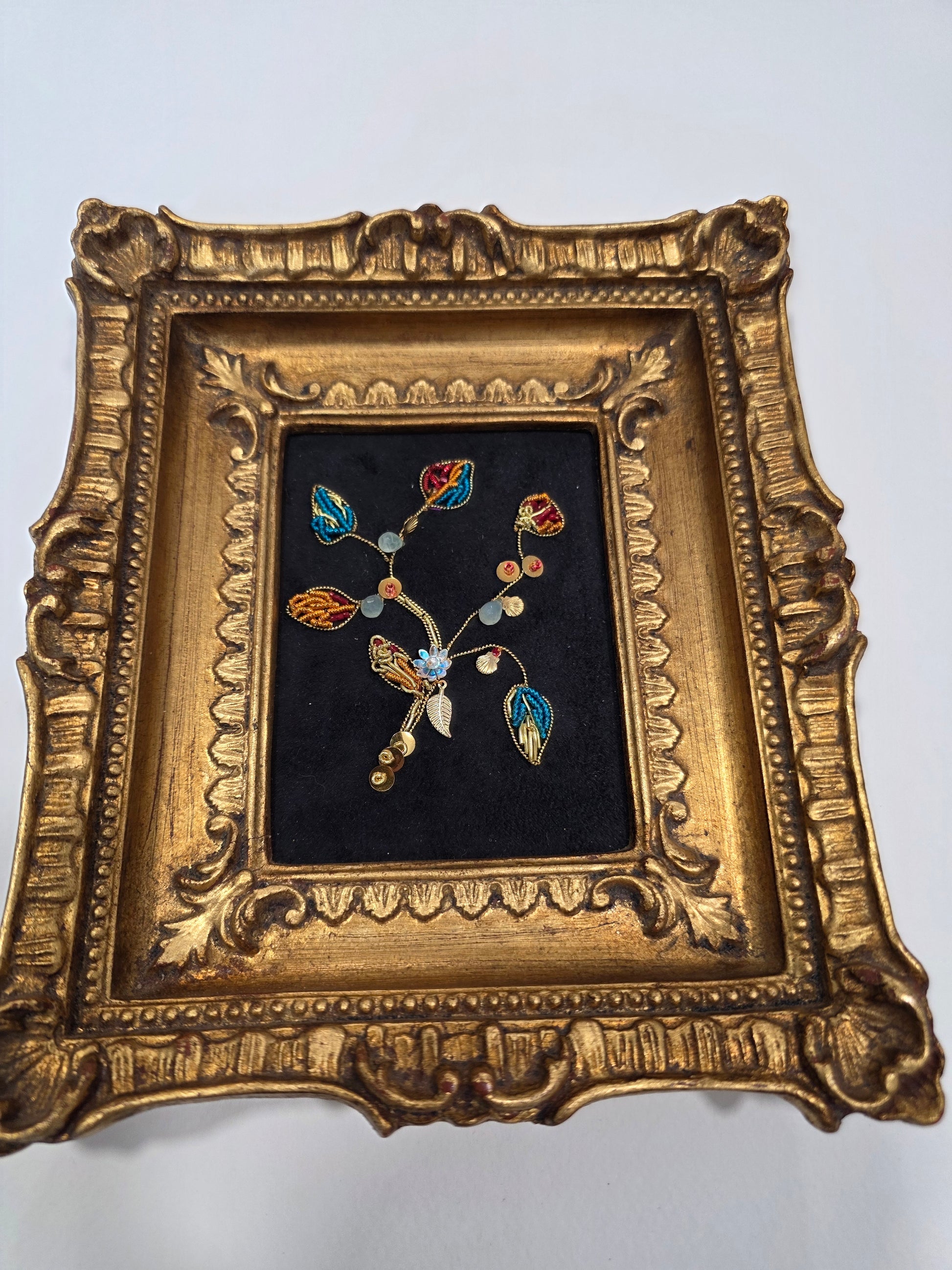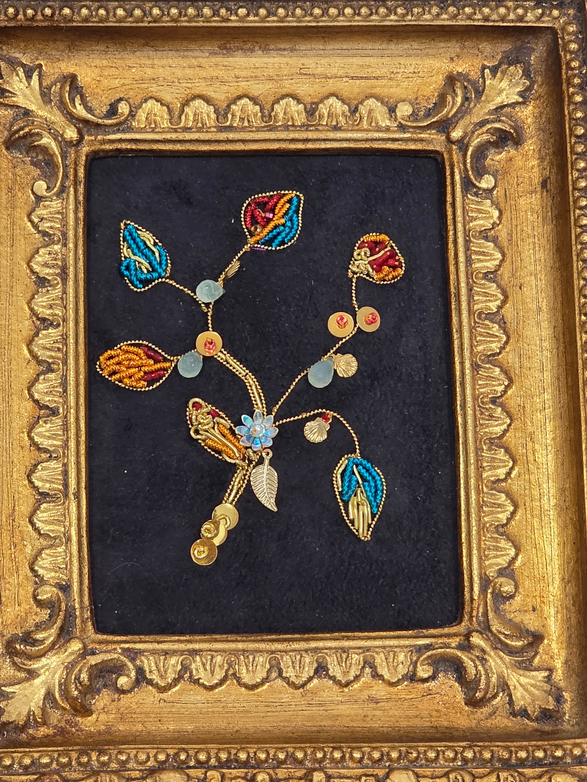 Ce cadre met en valeur un motif floral délicatement réalisé en broderie d’or. Les pétales colorés sont travaillés à l’aiguille avec la technique du jaseron et rehaussés de perles fines, donnant à la composition un éclat raffiné et précieux. Le contraste entre le velours noir et la brillance du fil d’or fait ressortir toute la richesse de ce savoir-faire artisanal.