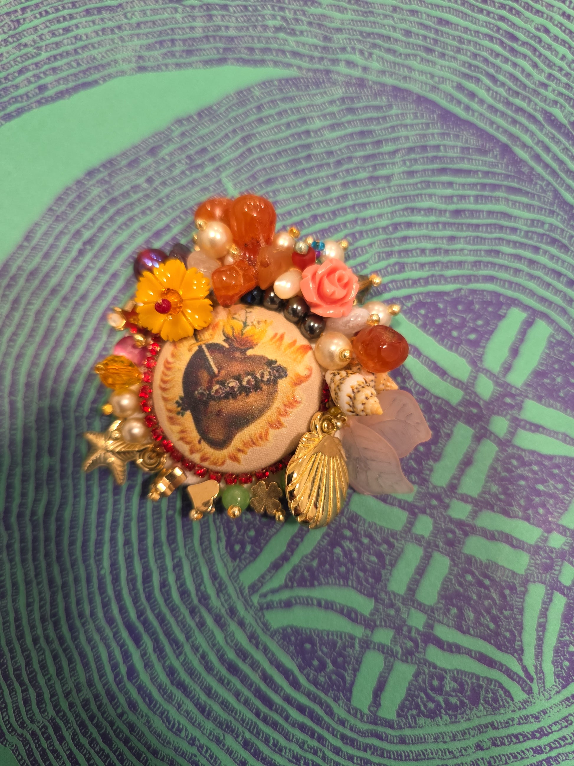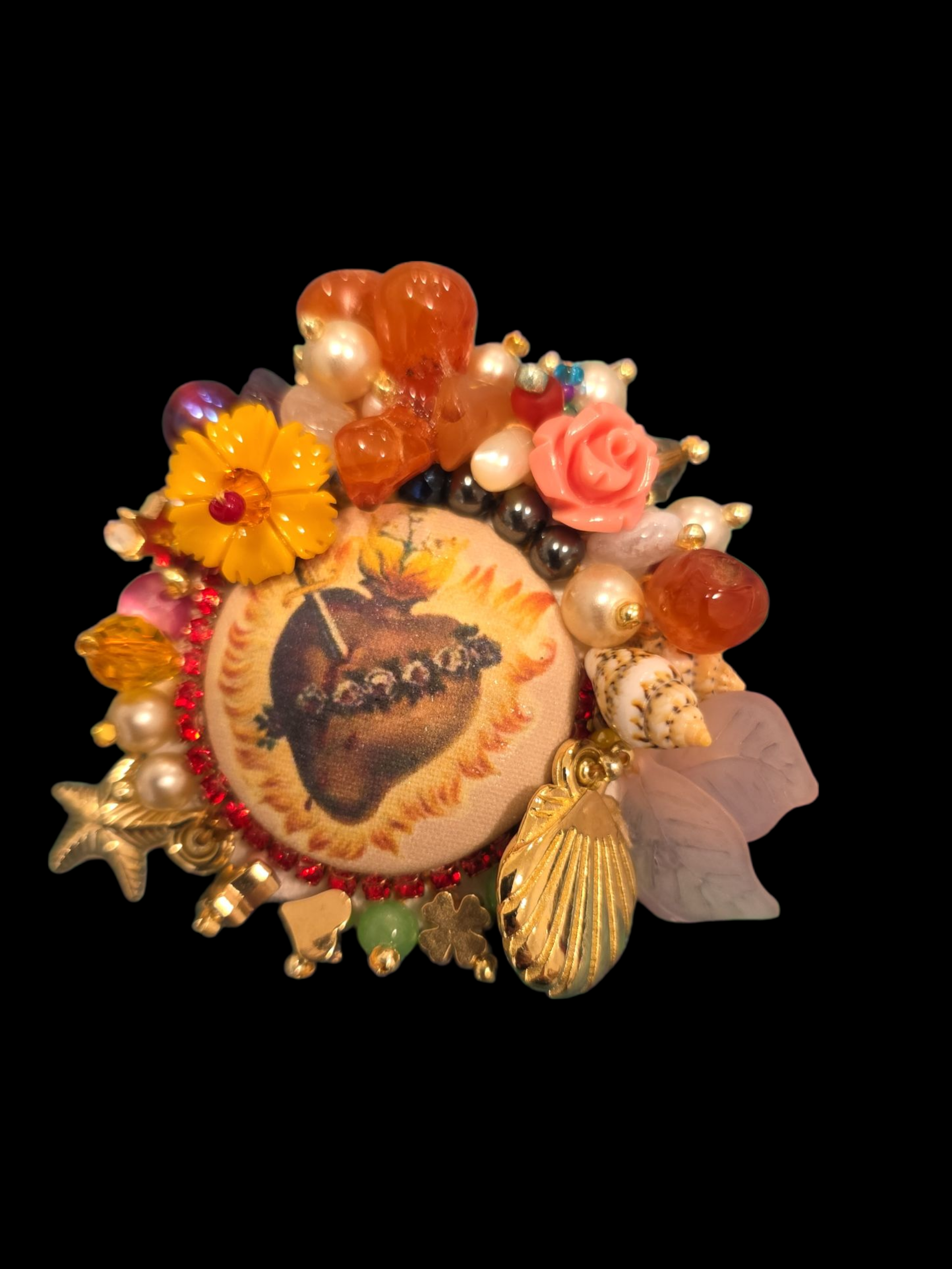 Sublimez votre tenue avec cette broche unique, entièrement réalisée à la main. Au centre, un médaillon textile orné d’un Sacré-Cœur flamboyant attire le regard par sa chaleur et sa puissance symbolique. Tout autour, un décor foisonnant mêle pierres naturelles de cornaline à l’éclat orangé-rouge, perles nacrées, perles noires, fleurs en résine, coquillages et breloques dorées.