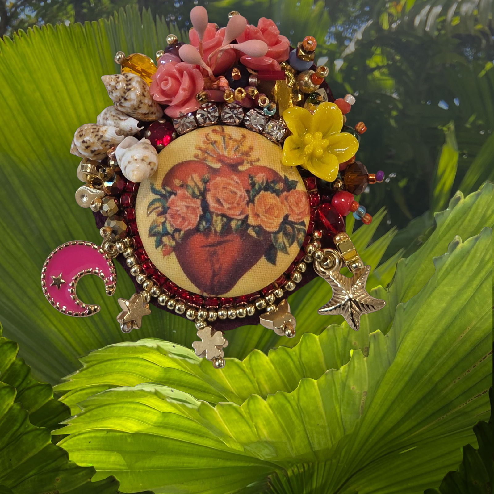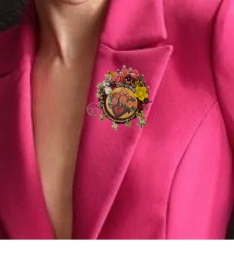 Cette broche au design raffiné associe un médaillon central orné d’un cœur romantique et d’un bouquet de roses pastel, mis en valeur par un sertissage de perles et de cristaux aux reflets lumineux.
