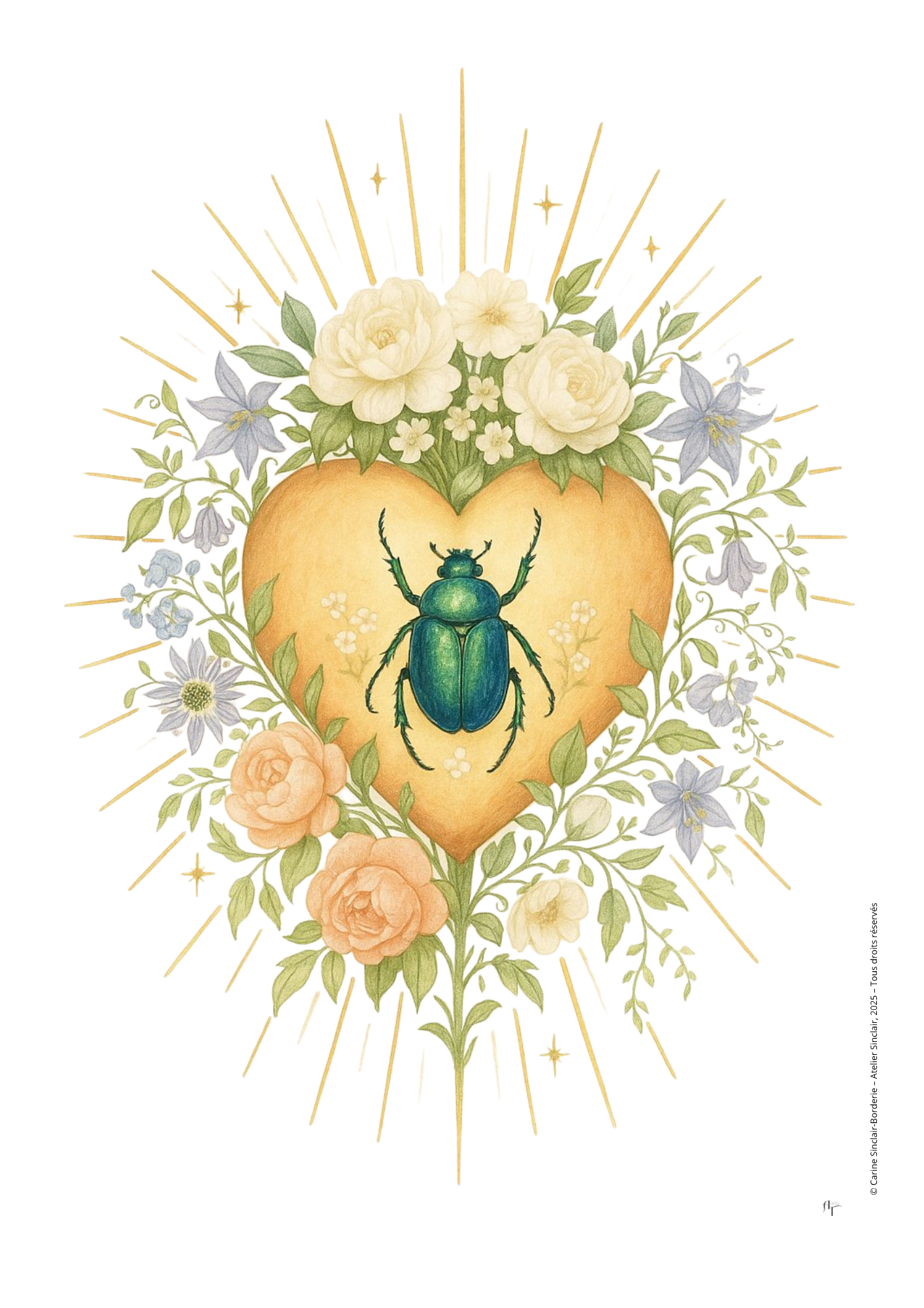 Affiche lumineuse où un scarabée vert irisé repose au centre d’un cœur doré, entouré de roses et de fleurs sauvages. Symbole de transformation et de force vitale, il capte la lumière comme un bijou. Les teintes chaudes et végétales apportent douceur et énergie à ton intérieur. Imprimée sur papier 300 g, prête à encadrer.