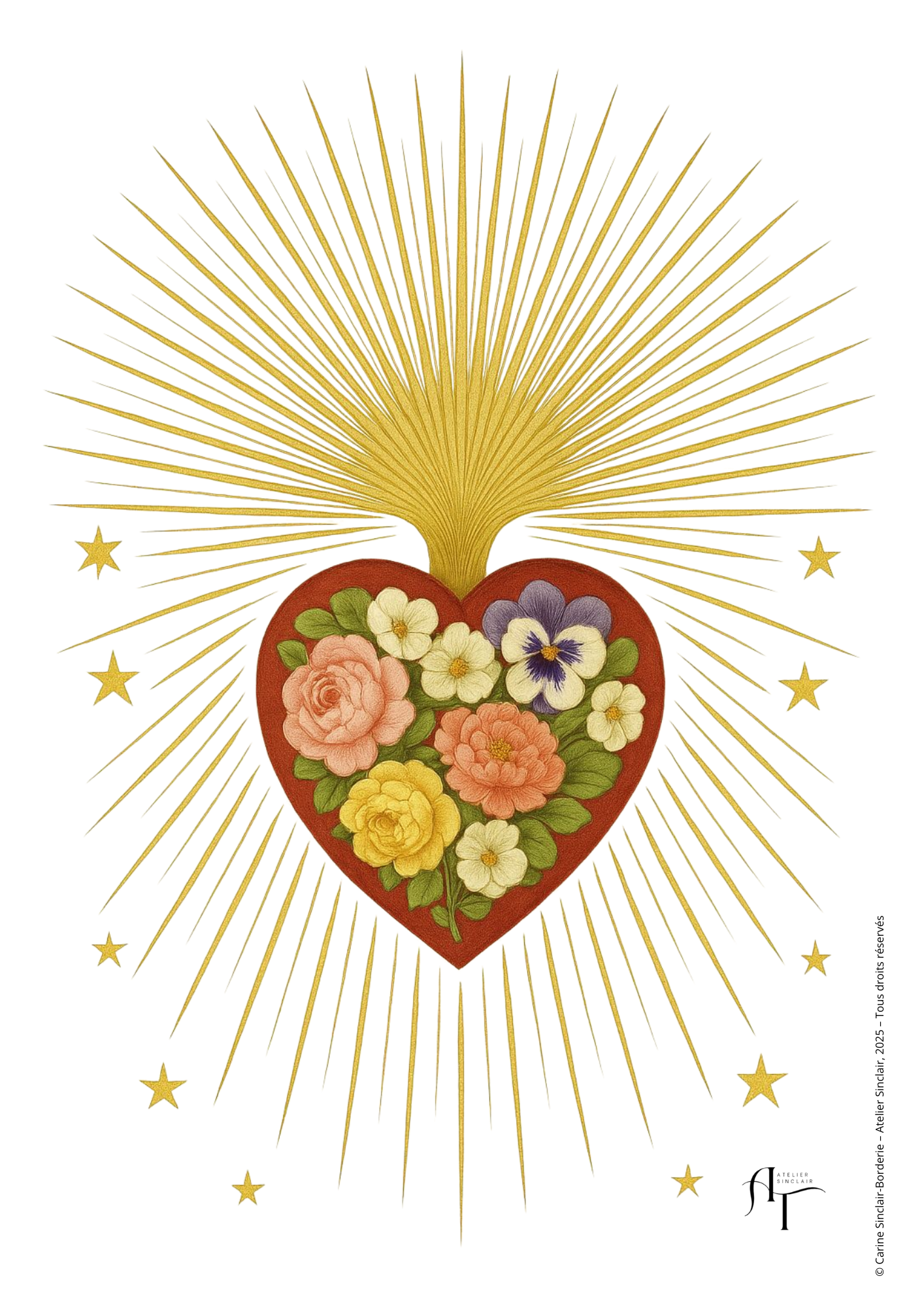 Lumière et délicatesse s’unissent dans cette illustration au cœur vibrant : un symbole intemporel d’amour et d’énergie vitale, orné d’un bouquet de fleurs délicates, comme un jardin secret qui s’épanouit dans la lumière. Ses rayons dorés évoquent la puissance du sacré et la chaleur du soleil, tandis que les étoiles qui l’entourent rappellent la magie de l’univers.