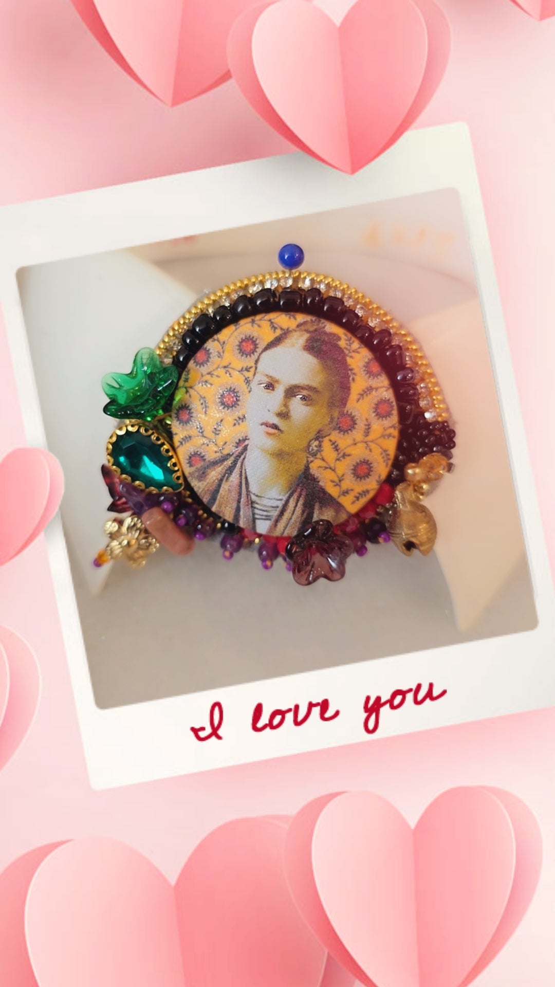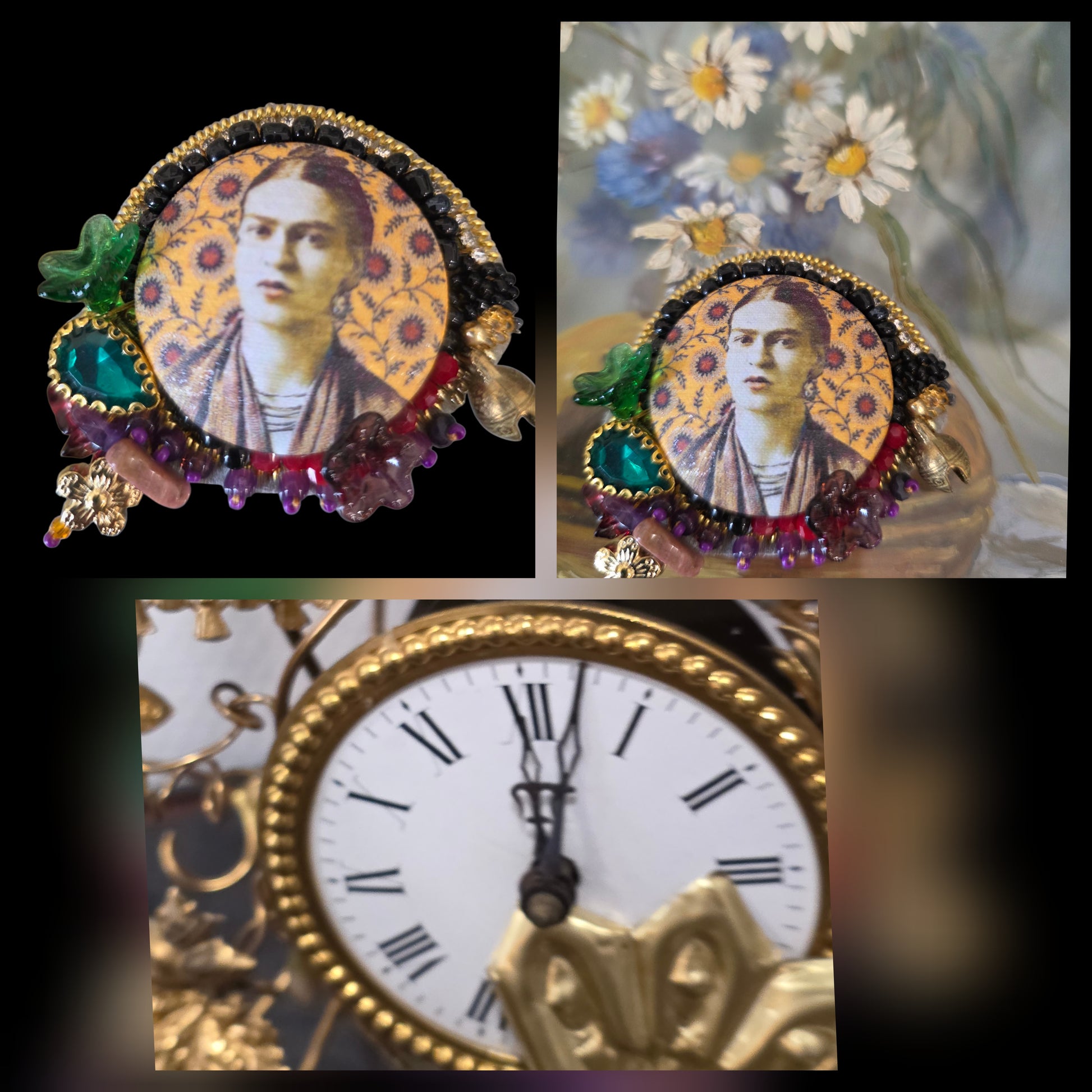 Cette broche unique rend hommage à l’icône intemporelle Frida Kahlo. Son portrait est mis en valeur par un fond fleuri aux accents vintage, entouré d’un éclat baroque de perles, de strass colorés et de motifs ciselés. Chaque détail raconte une histoire : l’émeraude verte qui rappelle la force de la nature, les perles violettes comme un souffle de mystère, et les dorures délicates qui ajoutent une touche de lumière.
