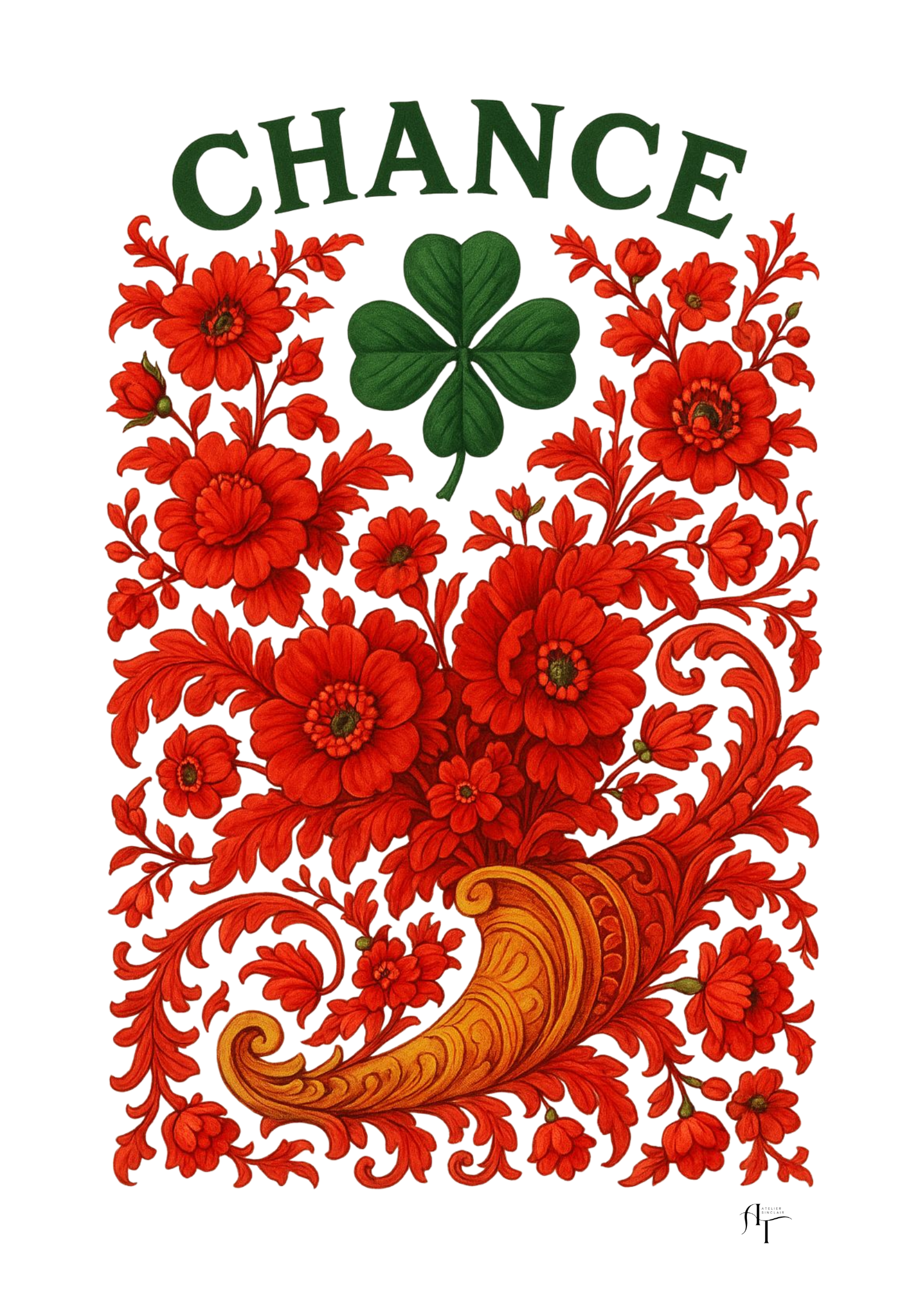 Cette illustration représente une corne d’abondance sculptée qui déploie une profusion de fleurs rouges ardentes, symbole de vitalité, de passion et de prospérité. Au sommet, un trèfle à quatre feuilles vient parfaire ce talisman visuel, associant chance et abondance dans une composition éclatante inspirée des enluminures anciennes.