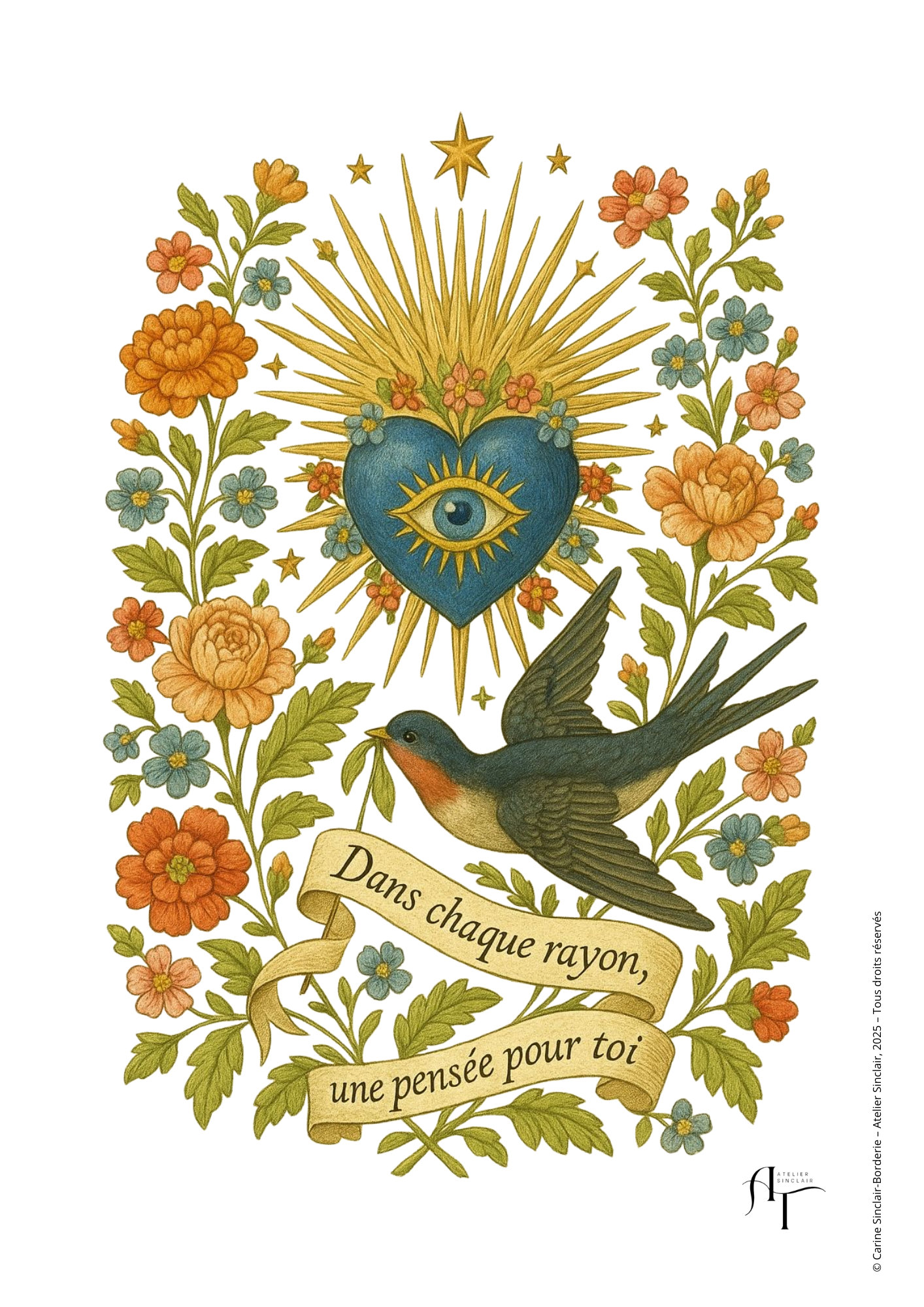 Au centre, un cœur bleu flamboyant, rayonnant de lumière et orné d’un œil protecteur, incarne la clarté et la vigilance du cœur. Tout autour, un foisonnement de fleurs colorées – pivoines, marguerites et volubilis – apporte une touche de vitalité et de douceur.