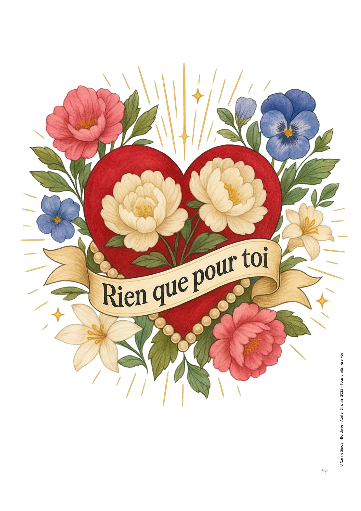 Un cœur rouge profond, entouré d’un bouquet de fleurs délicates et d’un ruban doré qui murmure “Rien que pour toi”. Cette affiche respire la tendresse, l’amour et la poésie d’un geste attentionné.