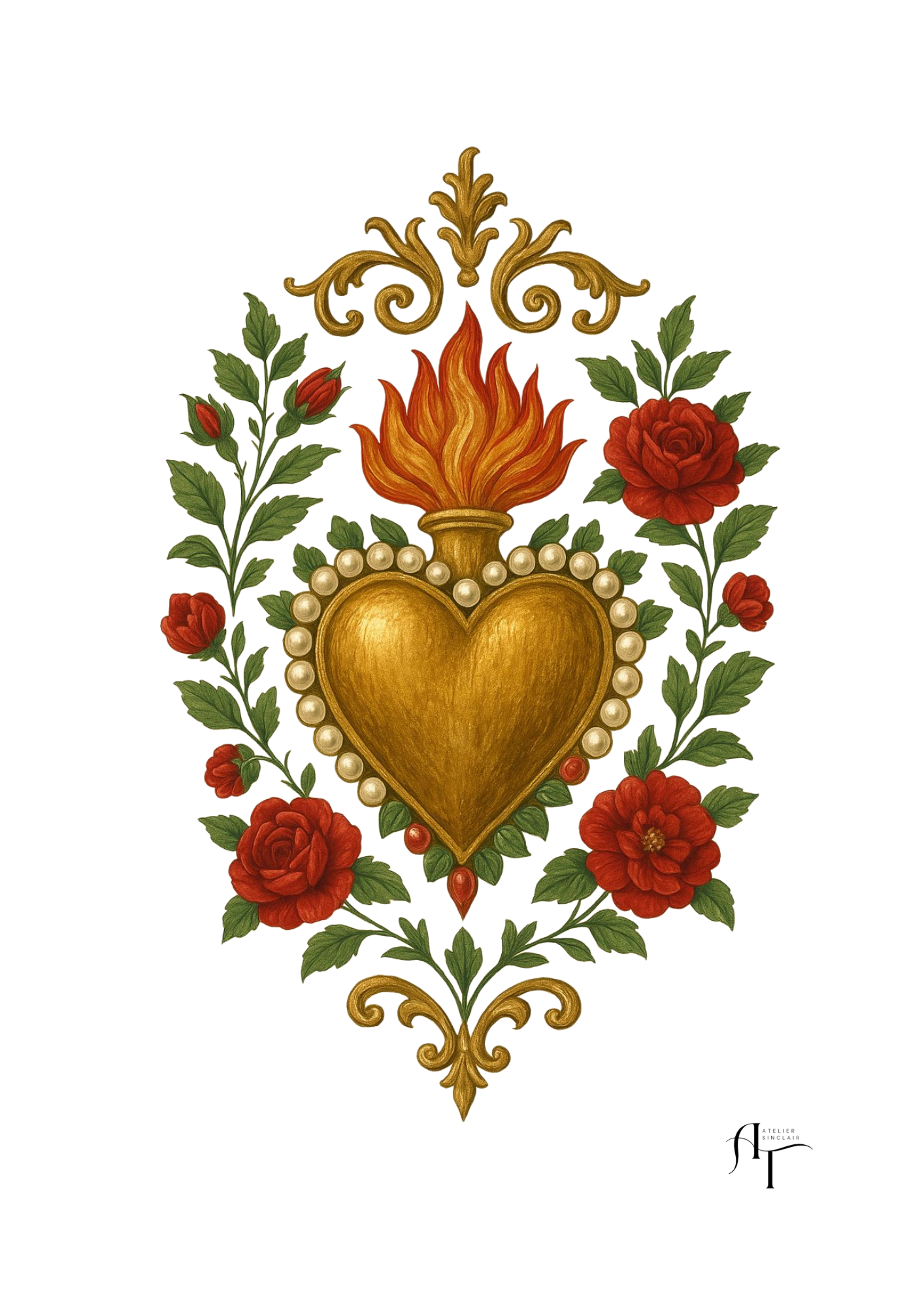 Un classique intemporel revisité : ce Cœur Sacré doré enflammé, entouré de majestueuses roses rouges, incarne à la fois passion, force et dévotion. Le cœur, orné de perles délicates et surmonté d’une flamme ardente, se dresse comme un symbole universel d’amour et de lumière.